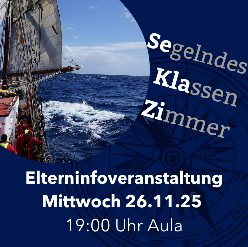 Am Dienstag, den 26. November 2025, lädt die Crew des Segelnden Klassenzimmers alle interessierten Eltern sowie Schülerinnen und Schüler um 19:00 Uhr herzlich zu einer Informationsveranstaltung in unsere Aula ein.