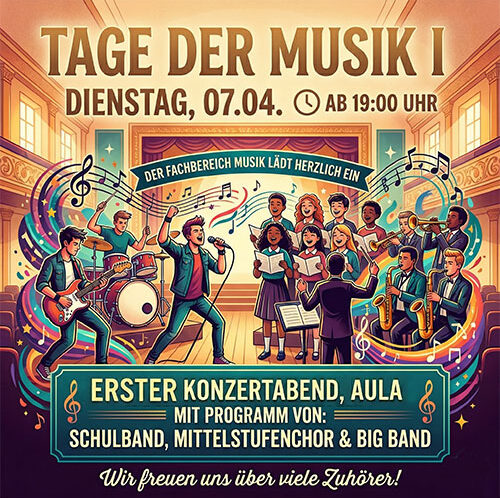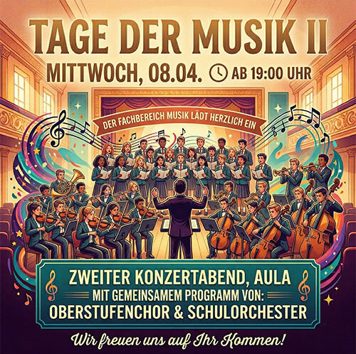 Euch und Sie erwartet ein Einblick in die Projekte des Kulturprofils, die im Laufe des Schuljahres 2025/2026 entstanden sind. Dazu werden Häppchen und Sekt gereicht. Außerdem besteht die Gelegenheit, einzelne Werke zu ersteigern. Das Kulturprofil freut sich auf viele Gäste, um gemeinsam den Abschluss der Oberstufenzeit zu feiern.
