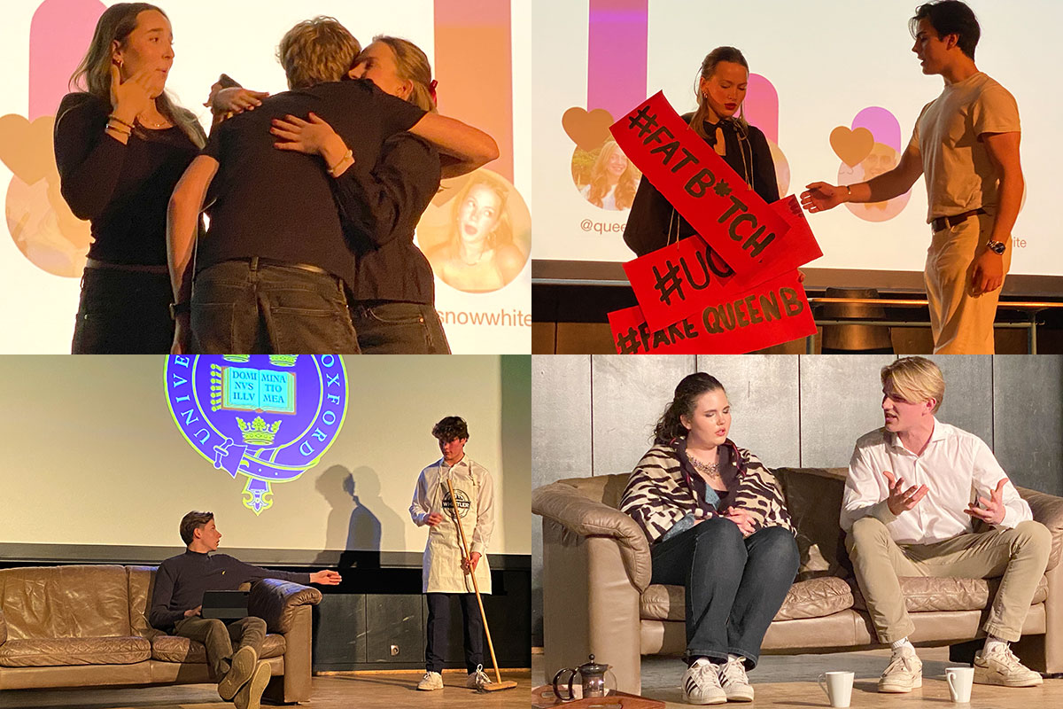 This was the 21st century world of multimedia where Red Riding Hood’s grandma (Blanca Vespermann)  is digitally conned out of her life-savings by  “bank advisor” Mr Hendrik Wolf, Hans in -or rather out of- Luck (Cajus Eichler) loses his job at a record lable and goes on a disasterous spending spree, Cinderella- or -eli (Constantin Slevogt) is forbidden by his father (Liam Becker) to enter the online Oxford University Essay Writing Competition and Snow White (Aliza Klußmann) suffers under the online hate comments instigated by jealous Queen B. (Amelie Midding). And of course they all lived happily ever after: Mr Wolf is unmasked and arrested, Hans discovers true happiness is to be found by trusting his songwriting talent, Cinder-eli wins his scholarship to Oxford and Snow White meets a prince in the real world who values her for her smartness.