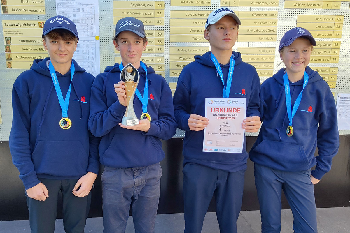 Nachdem sich unser Golfteam im Juni überraschend gegen das Gymnasium Hochrad im Landesentscheid durchgesetzt hatte, durfte es sich nun beim Bundesfinale von „Jugend trainiert für Olympia“ in Berlin mit den besten Schulen Deutschlands messen – und am Schluss als deutscher Meister vom Platz gehen!