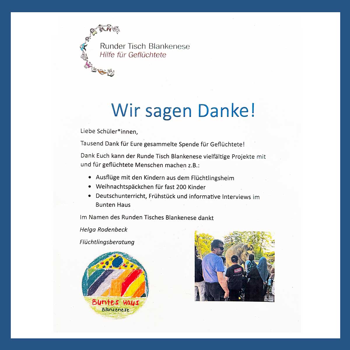 Am Tag des sozialen Engagements haben unsere Schülerinnen und Schüler tatkräftig angepackt und so gemeinsam einen großen Spendenbetrag von fast 9000 Euro erarbeitet. Die gesammelten Spenden gingen in diesem Jahr an den Runden Tisch Blankenese – Hilfe für Geflüchtete. Mit großer Freude hat sich der Runde Tisch nun bei uns bedankt.